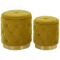 Add a retro touch to your interior with this set of storage pouffes. A unique shade of yellow colour, combined with a matching golden base makes this set stand out. Its one-of-a-kind design is reinforced with button tufting and thick fabric ropes, which creates a diamond-shape pattern on the surface. Capacious storage, hidden away behind a lid on top of both pieces, allow for smaller throws and pillows to be stored when not needed. Details: Color: Yellow, Gold. Main material: Velvet. Additional material: Nonwoven Fabric, Plywood, Stainless Steel. Material Composition: 100% Polyester Weight: 6 Assembly: Does Not Require Assembly Weight Capacity: 100 Legs Height: 5