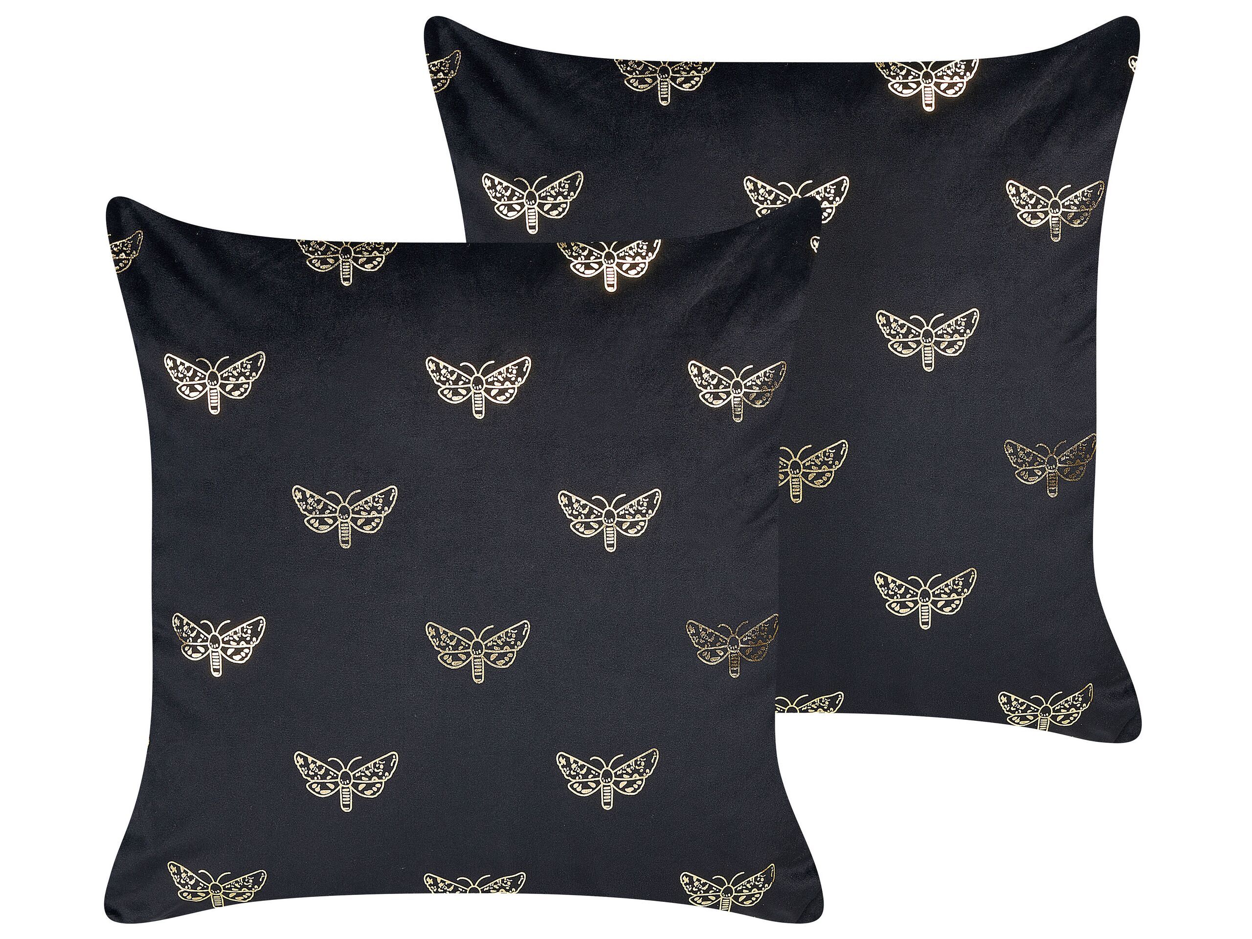 Make your home décor look elegant and cosy with this set of two cushions. Made from velvet and embellished with foil print, each cover features a soft filling and a zip fastener. Thanks to the beautiful butterfly pattern, the cushion set will add charm to any modern and traditional interior. Details: Color: Black, Gold. Main material: Velvet. Material Composition: 100% Polyester Assembly: Does Not Require Assembly