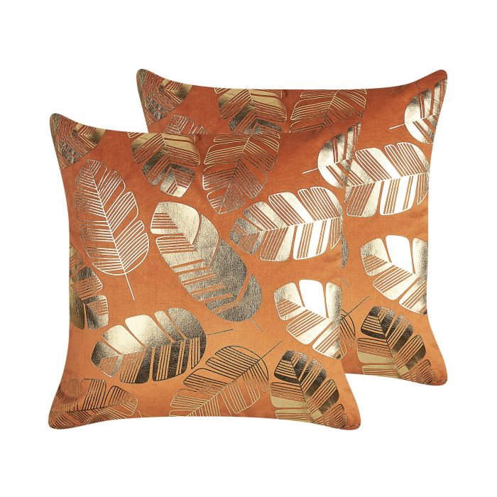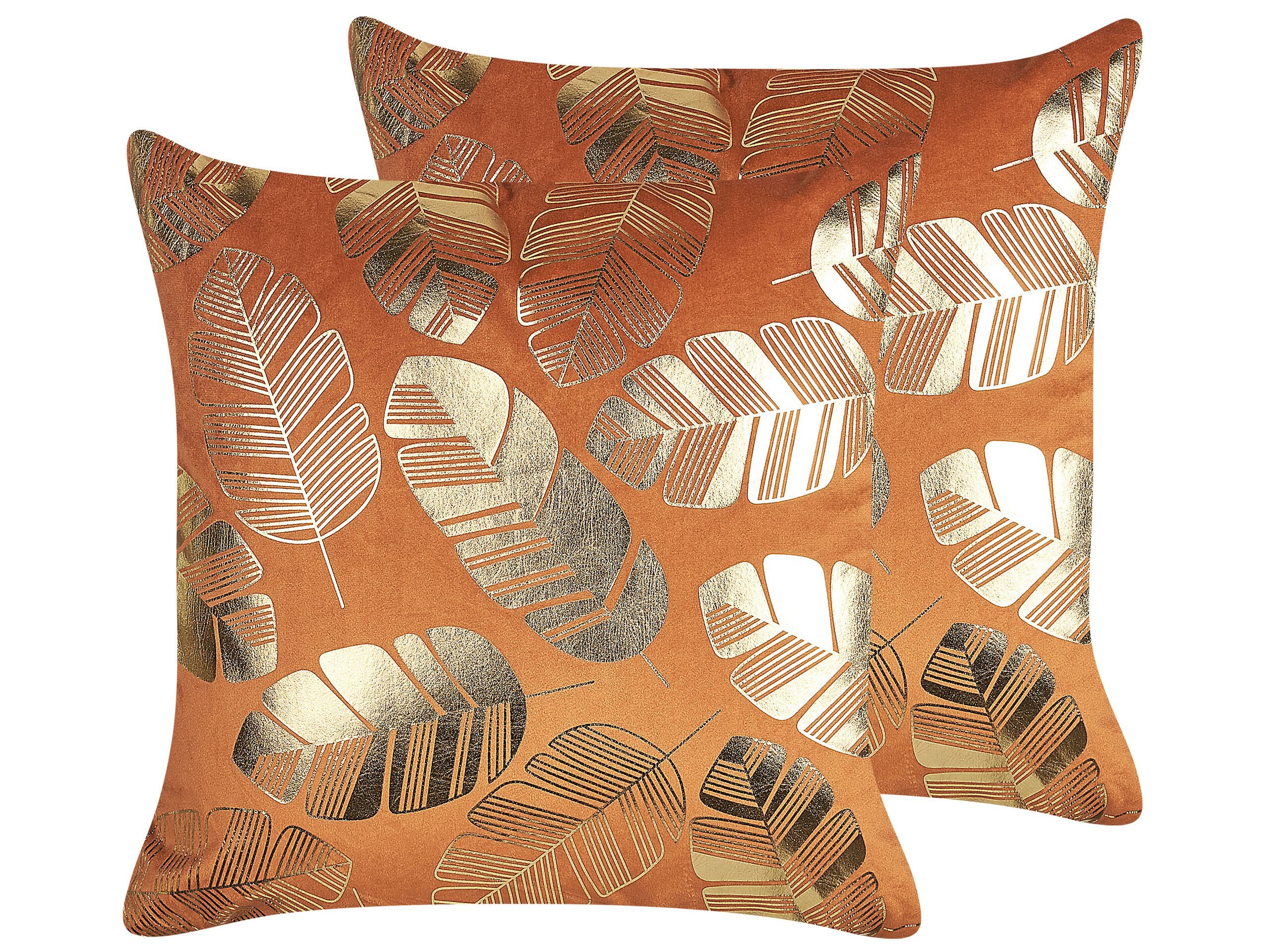 Boost your interior décor by bringing in this gorgeous set of cushions. Featuring a printed pattern of leaves, it will change the look of any sofa, bed or armchair. The vibrant, orange shade perfectly coordinates with gold accents, creating a throw cushion that suits any modern and glamour space. Details: Color: Orange, Gold. Main material: Velvet. Material Composition: 100% Polyester Assembly: Does Not Require Assembly
