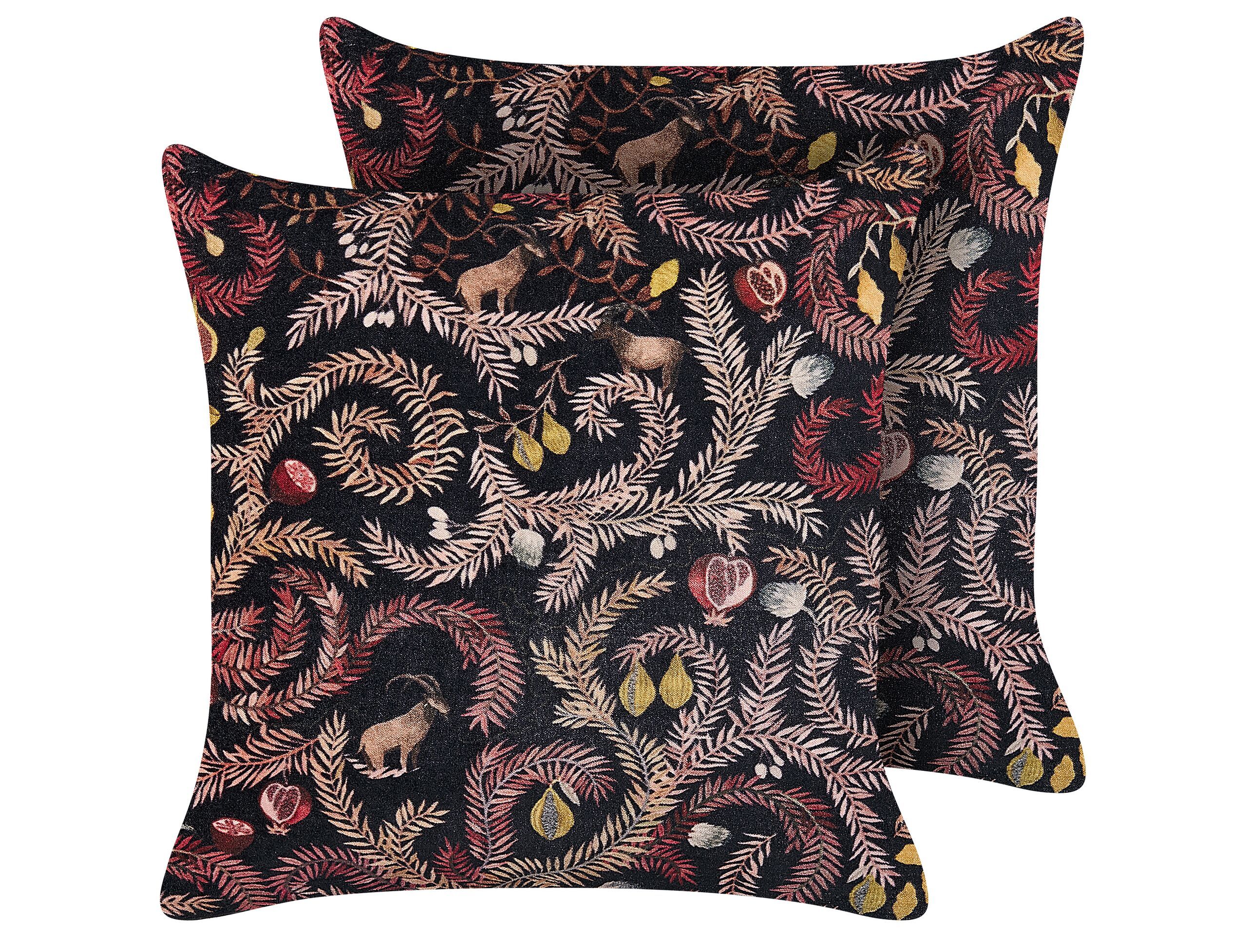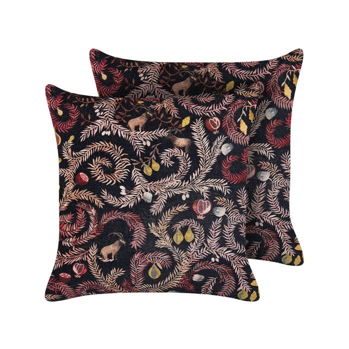 Set of 2 Velvet Cushions with Botanical Pattern 45x45cm Black and Pink