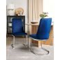 The set of high-back chairs complement any dining room or living room and offer the ultimate comfort and a sophisticated design. A shiny chromed frame matched with a soft velvet upholstery of these chairs give any room incredibly modern and sleek appearance. The dark blue colour goes well with a white or wood dining table - such a combination will generate an upscale and cosy interior. Details: Color: Blue, Silver. Main material: Velvet. Additional material: Plywood, Metal. Material Composition: 65% Polyester, 35% Cotton Weight: 9 Assembly: Legs to be Fitted Weight Capacity: 120 Padding Thickness: 7 Seat Height: 48