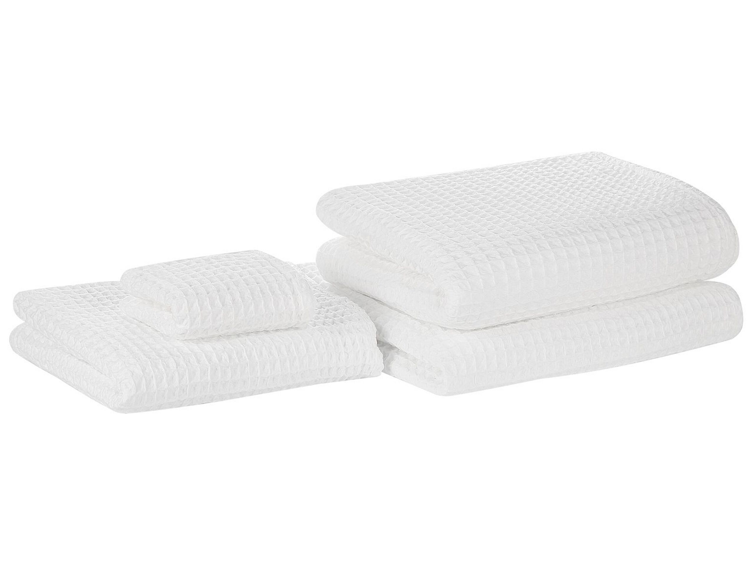 This set of exquisitely soft and fluffy towels is the best choice for your bathroom. It includes everything you may need: a guest towel, hand towel, bath towel, and a bath sheet. The patterned texture is pleasant to the touch as well as adds visual appeal. Made from quality cotton using long fibres they are soft on skin and perfect for everyday use. Low twist weave assures high absorbency and quick drying. Details: Color: White. Main material: Cotton. Material Composition: 100% Cotton Weight: 1 Assembly: Does Not Require Assembly