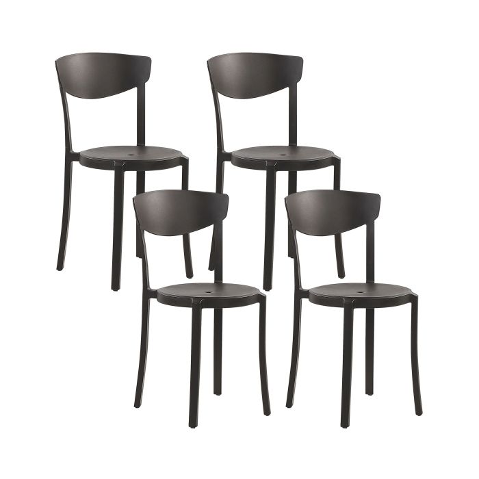 These minimalistic chairs are the perfect addition to enhance your outdoor space or dining room. With their lightweight and stackable structure, accompanied by a sleek matte finish and contemporary design, they effortlessly blend style and functionality. It is an ideal choice for any dining area, as the plastic surface can be effortlessly wiped clean. The chairs' simple outline makes them an easy fit with any modern decor style. Details: Color: Black. Main material: Synthetic Material. Weight: 4 Assembly: Does Not Require Assembly Weight Capacity: 150 Seat Height: 45