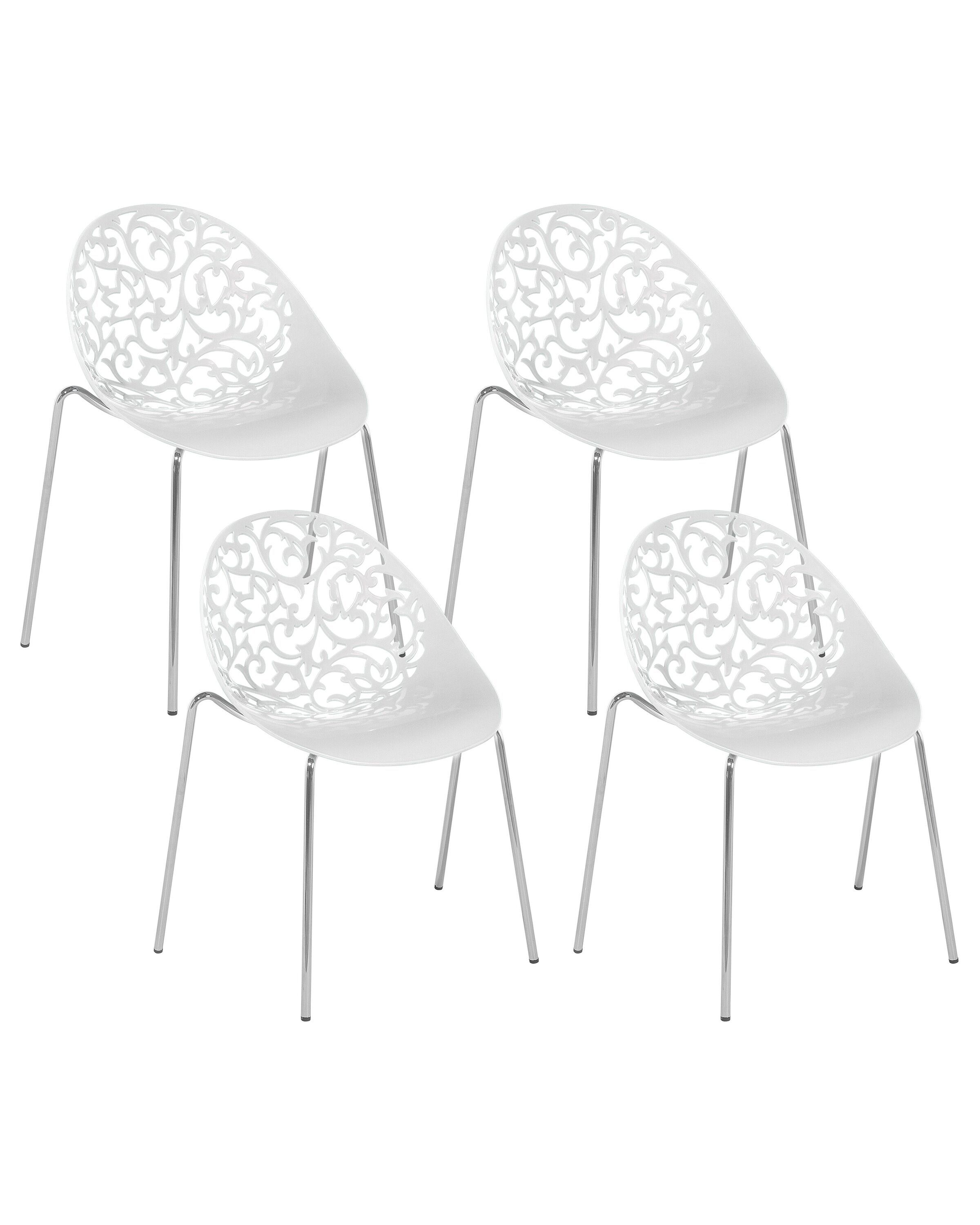 This modern set of four chairs is extremely versatile and eye-catching. Four slim chrome legs support a comfortable seat with a floral openwork white backrest. They are highly practical thanks to the universal seat height, matching dining rooms, kitchens as well as office spaces. Details: Color: White. Main material: Synthetic Material. Additional material: Metal. Weight: 4 Assembly: Partial Assembly Required Weight Capacity: 100 Seat Height: 42