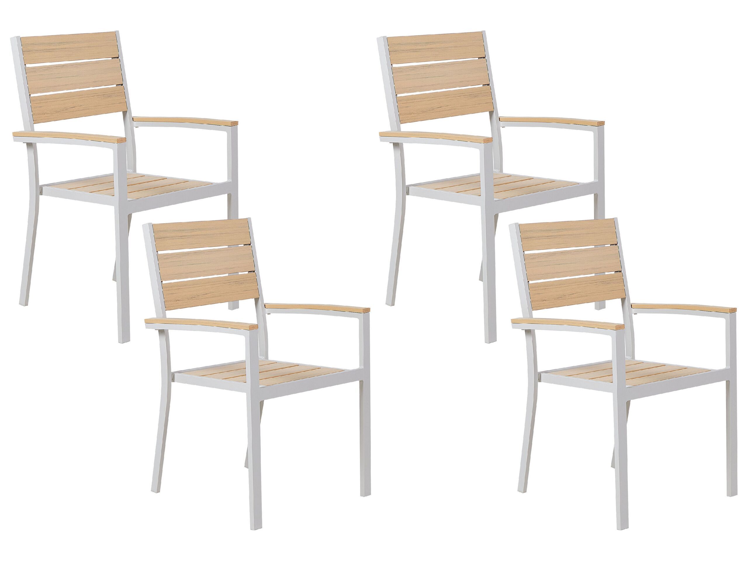 This set of garden dining chairs is the perfect option for furnishing your outdoor social space in a minimalist aesthetic. The powder coated aluminium frame and faux wood slats are sturdy. The wide seat and backrest support the body comfortably. This set will see you through all seasons so you can enjoy the outdoors in style. Details: Color: Beige, White. Main material: Plastic Wood. Additional material: Aluminium. Weight: 6 Assembly: Does Not Require Assembly Weight Capacity: 130 Seat Height: 42