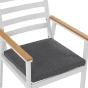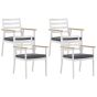 Enjoy your dinner outdoors in utter comfort thanks to these dining chairs. Their white aluminium construction is finished in powder coating for a long-lasting effect. The classic, slatted back give the chairs a Scandinavian touch which makes them a perfect fit for a wide range of traditional and modern settings. The armrests are covered with synthetic wood which protects from the cold metal and introduces a bit of contrast. They come with matching seat pads in a complementary dark grey colour. Details: Color: White, Light Wood, Grey. Main material: Aluminium. Additional material: Polyester, Plastic Wood. Material Composition: 100% Polyester Weight: 5 Assembly: Full Assembly Required Weight Capacity: 150 Cushions Dimensions: 45x50 Padding Thickness: 5 Seat Height: 40