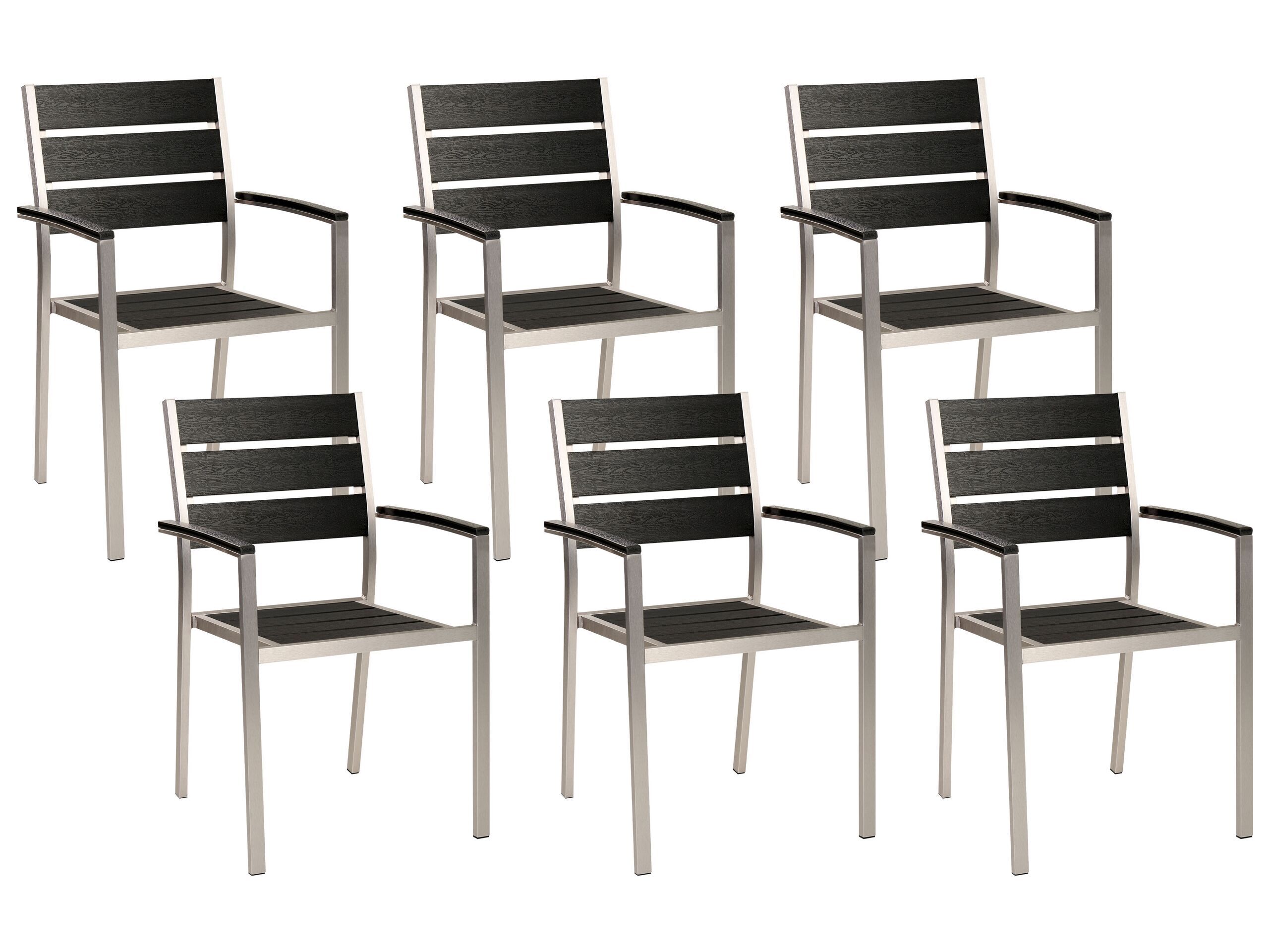 This set of six dining chairs is sure to make an elegant addition to any traditional or modern garden. The chairs feature a robust, aluminium frame to ensure the stability and longevity of the furniture. A wide seat and a classic backrest made from durable synthetic wood guarantee comfortable dining as well as support for the back. Paired with one of our stylish tables, this weather-resistant furniture will serve for many years of outdoor celebrations and family events. Details: Color: Black, Silver. Main material: Plastic Wood. Additional material: Aluminium. Weight: 6 Assembly: Does Not Require Assembly Weight Capacity: 150 Seat Height: 45