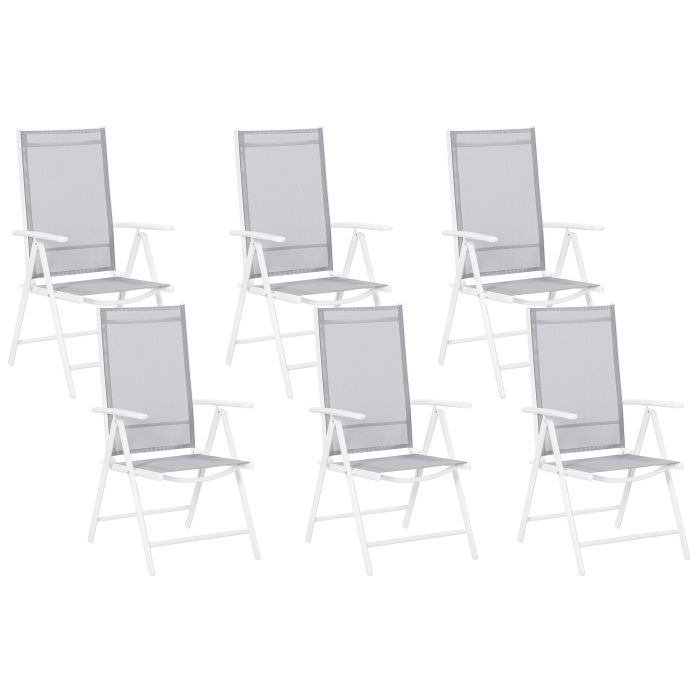 The straightforward style and functionality of these chairs makes them the perfect addition to a balcony, garden or poolside and will suit any kind of decor. Featuring a textile cover over an aluminium frame treated with powder coating for long-lasting usage, the chairs are adaptable for your comfort with 5 settings for reclining. Thanks to the easy folding feature, the seats are ideal for narrow outdoor areas. Details: Color: Grey, White. Main material: Aluminium. Additional material: Polyester, PVC. Material Composition: 90% PVC, 10% Polyester Weight: 4 Assembly: Does Not Require Assembly Weight Capacity: 130 Seat Height: 43