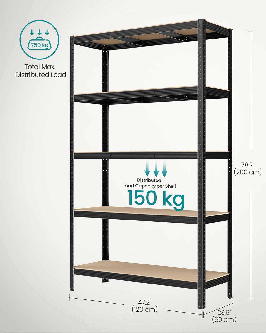 Shelving Unit - TARLIA 5 Tier Heavy Duty Steel Storage Unit with 750 kg Capacity - Black
