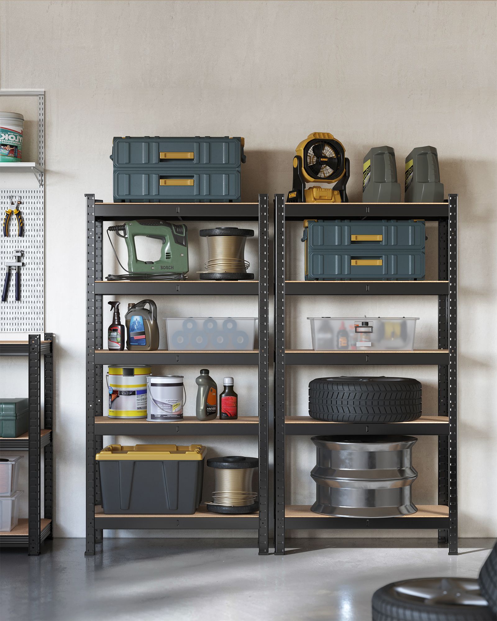 Organize your garage with this set of two heavy-duty shelving units. Each unit features five adjustable, reinforced steel shelves, capable of holding up to 175 kg per tier for a total capacity of 875 kg. The silver, 180 x 90 x 40 cm units offer robust storage for all your garage essentials.