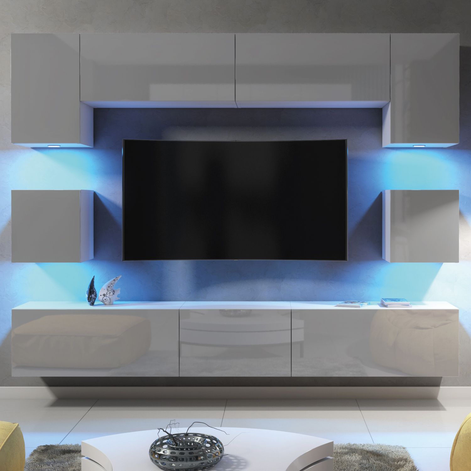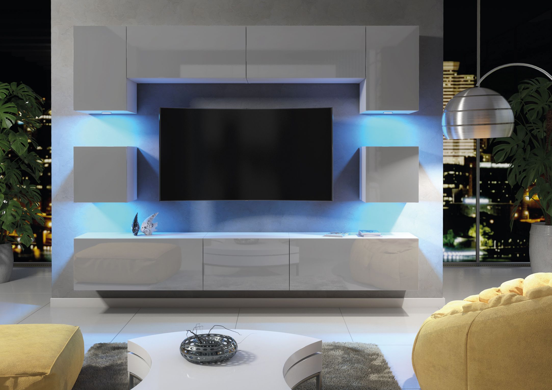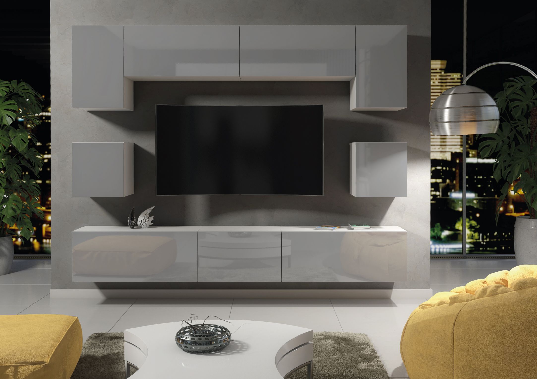 The SHINE Wall TV Unit transforms your living room into a bold and sophisticated centerpiece, offering a 9-piece wall-mounted ensemble that embodies contemporary elegance and practicality. Measuring 242cm (W) x 207cm (H) x 35cm (D), this striking unit is designed to make a statement while providing ample storage and display options. Crafted with a matte body and sleek high-gloss doors, the unit features a seamless handle-free push-to-open system, combining minimalist design with effortless functionality. Spacious compartments behind the doors provide the perfect solution for organizing your living space and keeping it clutter-free. Adding to its appeal, the SHINE Wall TV Unit is equipped with RGB LED lights, allowing you to customize the ambiance to suit any mood or occasion. Available in White & Gloss Doors, White & Grey Gloss Doors, and Dark Grey & Gloss Doors, the SHINE Wall TV Unit offers a perfect blend of cutting-edge design and everyday functionality, redefining the modern home.
