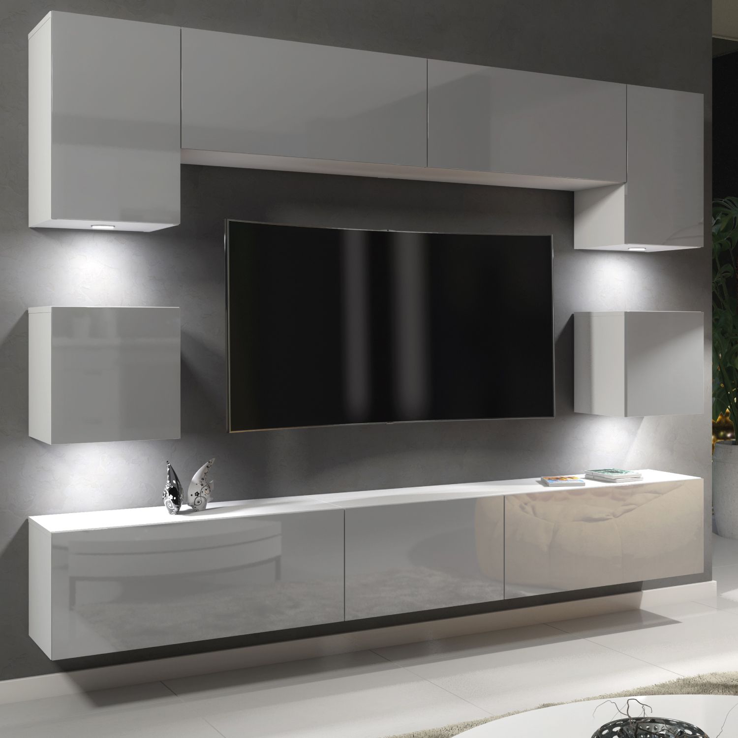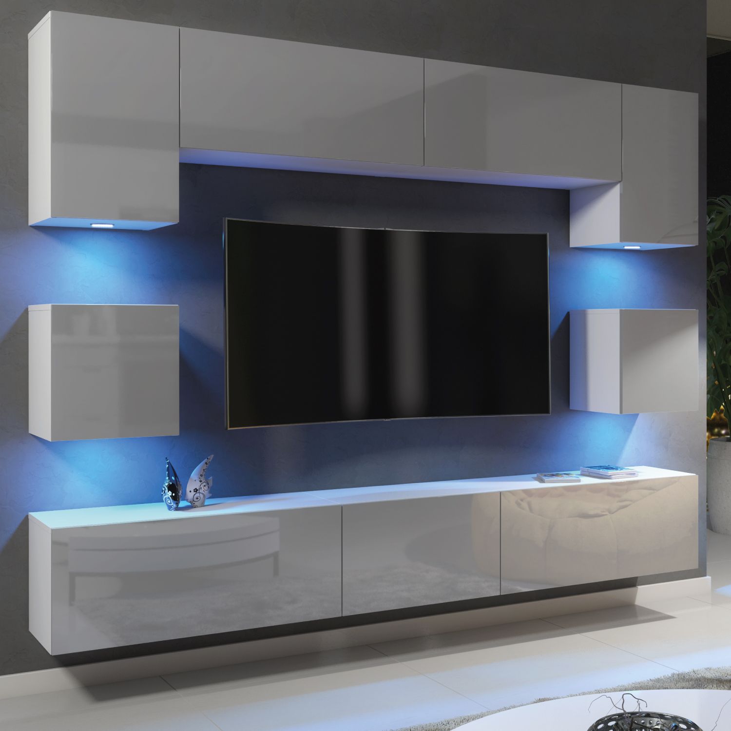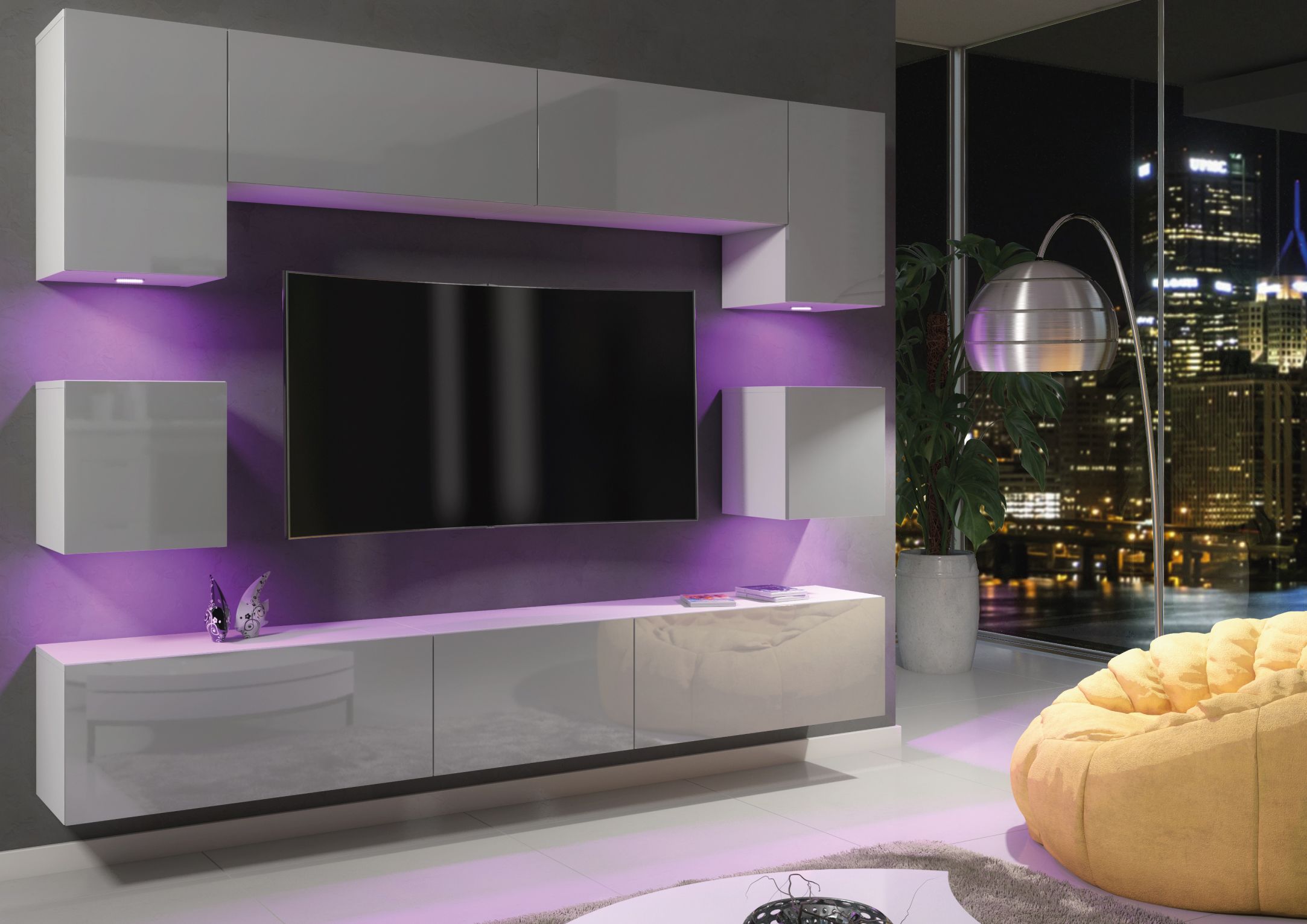 The SHINE Wall TV Unit transforms your living room into a bold and sophisticated centerpiece, offering a 9-piece wall-mounted ensemble that embodies contemporary elegance and practicality. Measuring 242cm (W) x 207cm (H) x 35cm (D), this striking unit is designed to make a statement while providing ample storage and display options. Crafted with a matte body and sleek high-gloss doors, the unit features a seamless handle-free push-to-open system, combining minimalist design with effortless functionality. Spacious compartments behind the doors provide the perfect solution for organizing your living space and keeping it clutter-free. Adding to its appeal, the SHINE Wall TV Unit is equipped with RGB LED lights, allowing you to customize the ambiance to suit any mood or occasion. Available in White & Gloss Doors, White & Grey Gloss Doors, and Dark Grey & Gloss Doors, the SHINE Wall TV Unit offers a perfect blend of cutting-edge design and everyday functionality, redefining the modern home.
