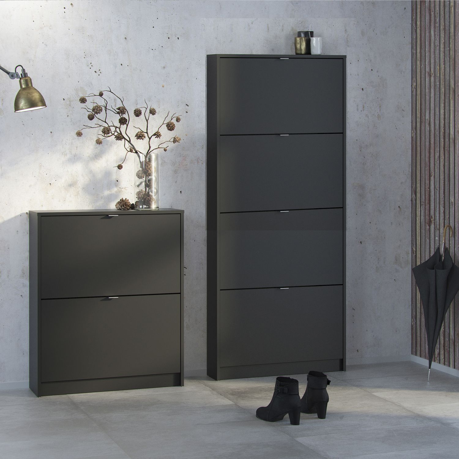 Shoe cabinet w. 4 tilting doors and 2 layers - Matt Black