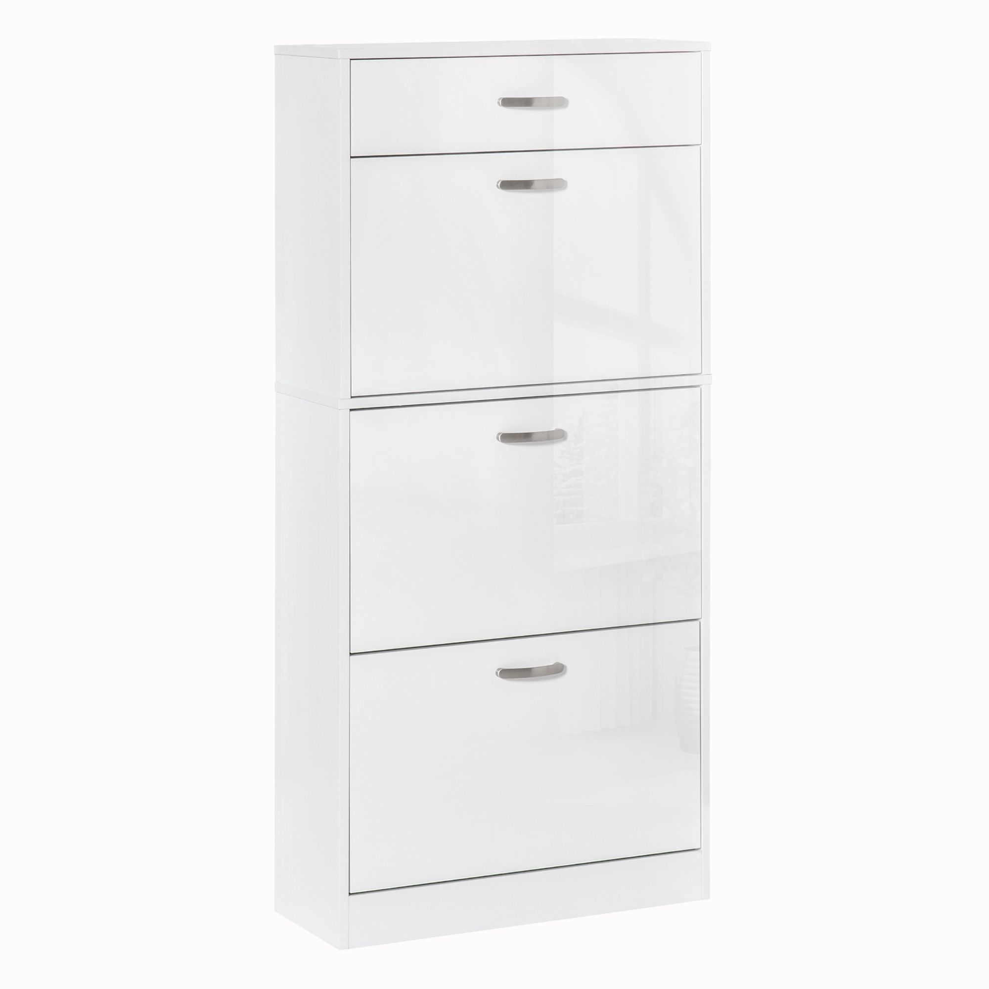 Choose this cabinet from will keep your home tidy. There are three flip drawers, each can hold six pairs - perfect for use with the family or your flatmates. The inner shelf can be set to two different positions for storage which fits your shoes better. Finished with a handy top drawer, offering even more storage. Made of particle board frame with gloss panel and aluminium handle, it is durable for everyday use. The high gloss storage unit in modern style is a great addition to your home.