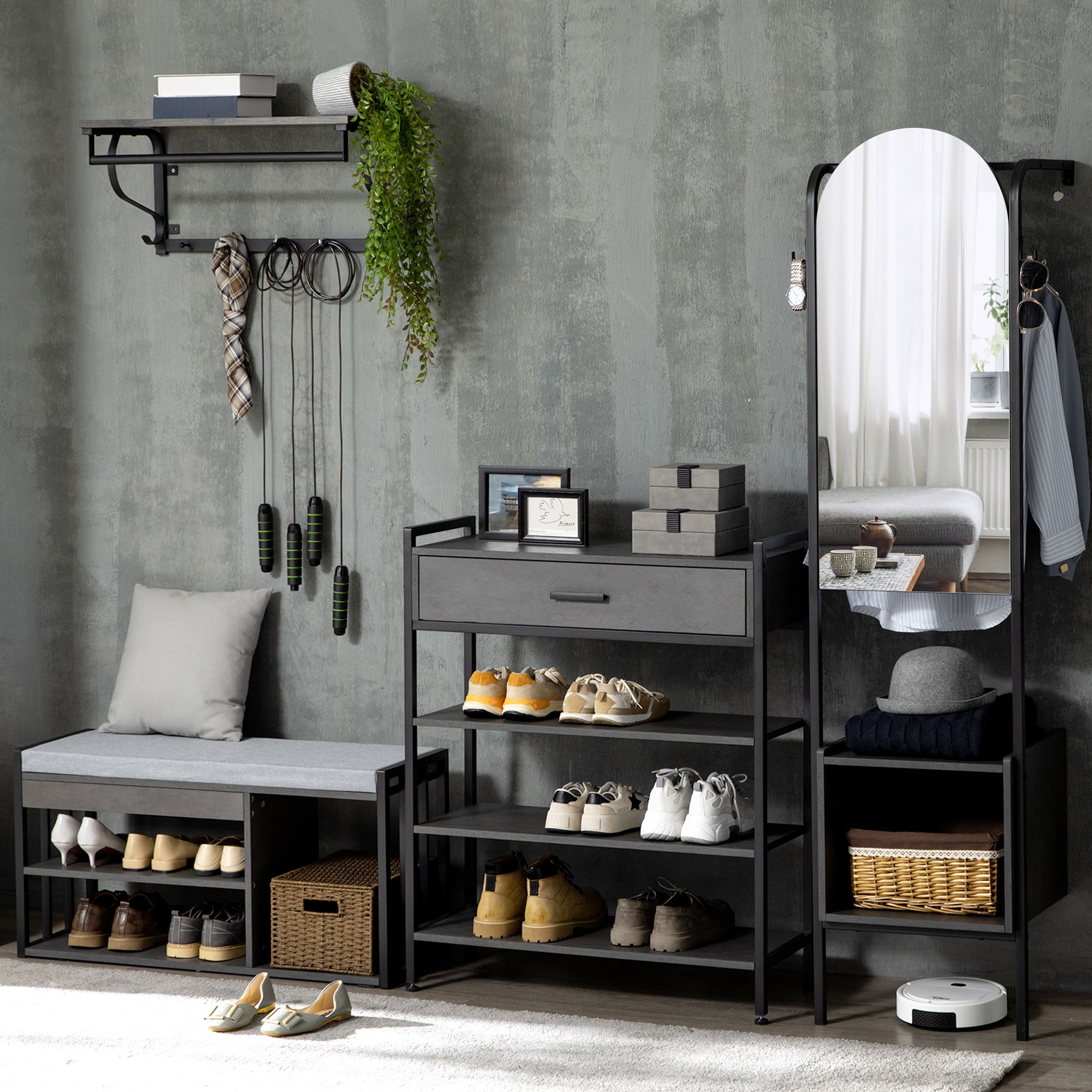Shoe Storage with Seat, Upholstered Entryway Bench, Shoe Bench with 3 Open Shelves for Hallway, Grey