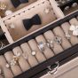 Description: jewelry box looks elegant, classic in design and never goes out of style. It adopts 3-layer design which has multiple function. It can be used for watches, necklaces, earrings, even if in travel. It is convenient to carry. Cover with mirror and a spring lock, to keep the items safety and cleaning. jewelry box which is easy to clean and maintain must be the essential decorations for every jewelry lover. Daily care note: Please keep it in a place with air circulation. Please avoid directly sunny illuminated. Please immediately remove surface water with hand or cloth, and dry in a cool, dry place if it is wet in surface. Please wipe the smudges or other marks use a cloth, to avoid the penetration of moisture inside it. Please use a small amount of care solution regularly to make its reproducible luster. Once the care solution penetrate the leather, then just wipe the surface of the leather. Please storage in some place where have good ventilation and suitable temperature of 10 to 40 degrees. Please do not press it to avoid distortion when storing. Please do not store acid and other chemicals. Product Parameter:Material: leatherette + Medium density fiberboard frame + velvetProduct dimensions: 26 x 17 x 18 cmFirst layer:Size of two sides grid storage box of 10.5 x 4.5 cmSize of middle earring grid storage box of 9.5 x 4.5 cmSize of lower ring lattice dimension of 21 x 4.5 cmSecond layer:Two storage box, each dimension of 14.5 x 9.5 x 2.5 cmThird layer:Size of small portable jewelry box on the left of 14 x 9 x 3.5 cmEach size of two watch box on the right of 9.5 x 4.5 x 3.8 cm, pillows dimension of 7 x 4.5 cmSize of the jewelry grid on bottom of 9.5 x 4.5 x 4 cm
