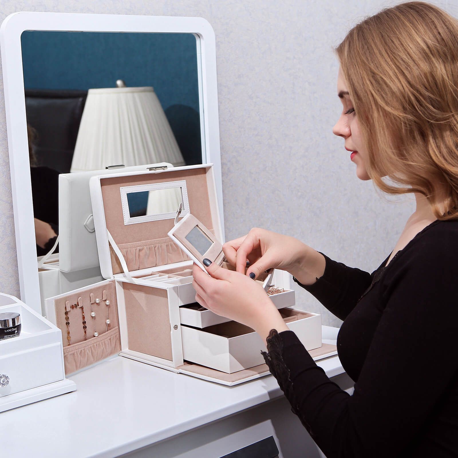 Are you tired of the tangle of necklaces and rings you've amassed? It's time to grab a jewellery box with an elegant and classic design to keep it all organised. Protects Your Jewels Designed with many compartments for different products and shapes, the jewellery case keeps your bracelets, rings, earrings, and necklaces well-stored. The soft velvet lining safely protects your delicate jewellery against scratches and other damage. Multiple Choices We have a variety of jewellery boxes in many sizes and colors, simply search "jewellery box" to find even more.