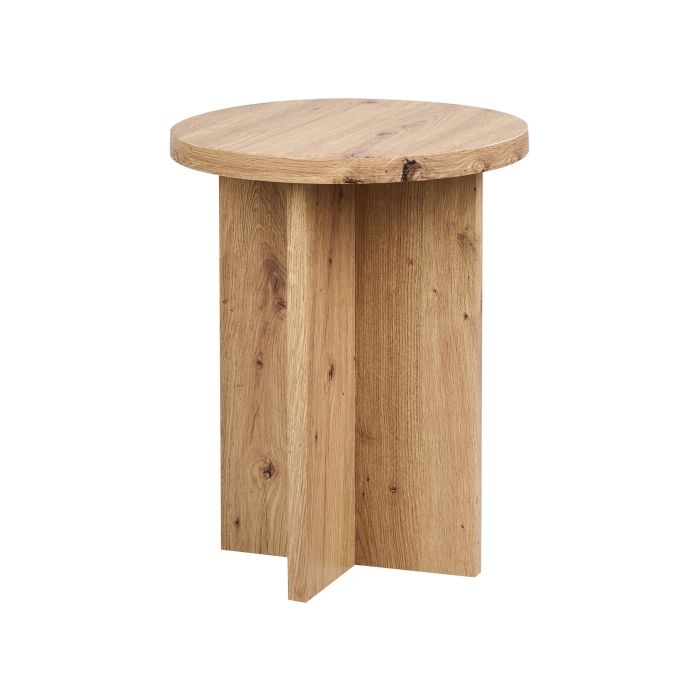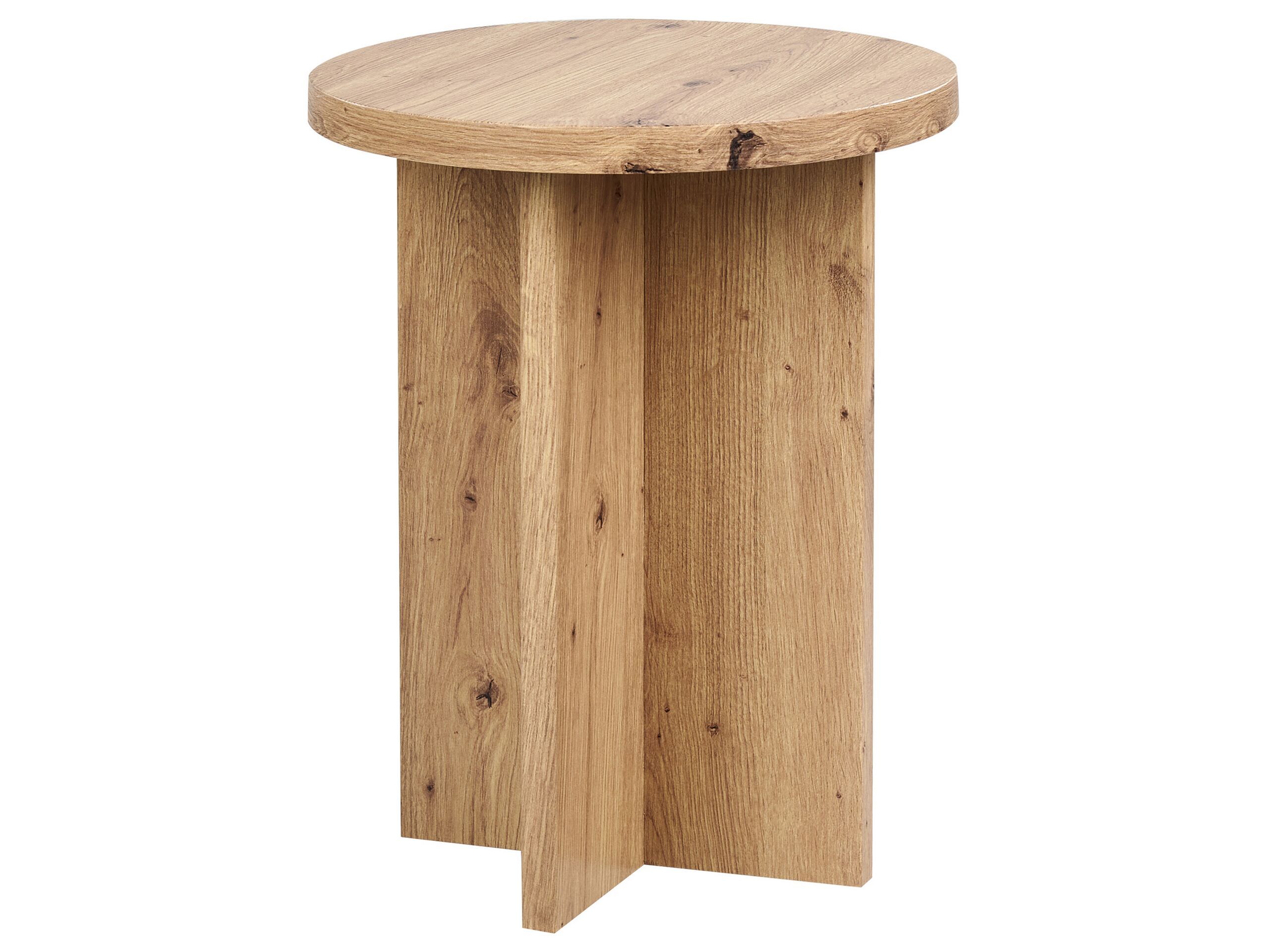 This side table is surely going to turn the heads of all your houseguests. Made out of MDF, and finished with wood-like veneer, the piece is very durable and low maintenance. Its base guarantees stability to the table, and its round top is perfect for exposing your favourite accessories, photos, plants or other decorative items. Details: Color: Light Wood. Main material: MDF. Weight: 10 Assembly: Full Assembly Required Weight Capacity: 20 Legs Height: 52