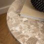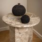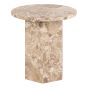 Geometric side table with clean lines and unique stone variations. Round tabletop and hexagonal pillar base add drama and sophistication to any interior