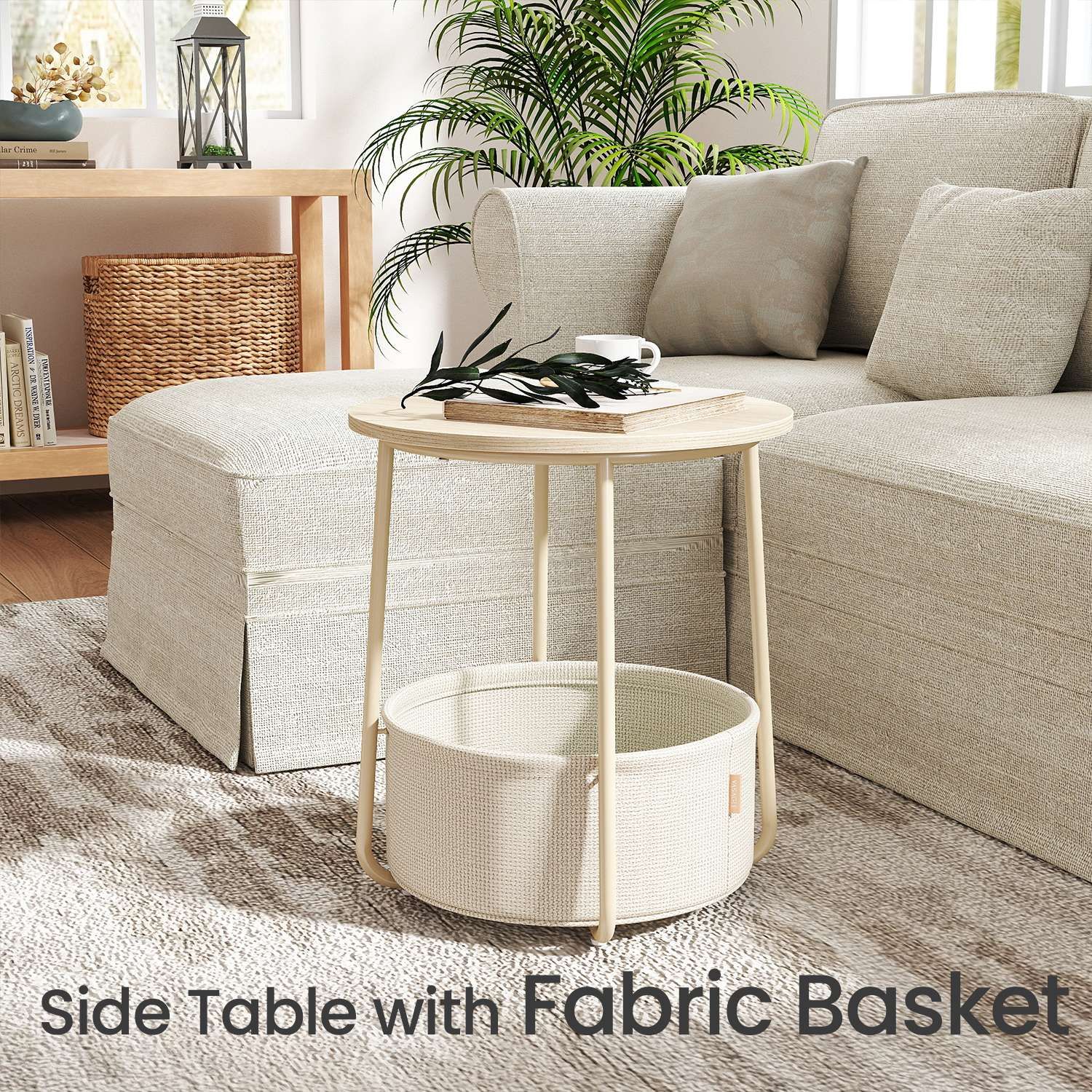 Side Table - VERRA Round End Table with Fabric Basket - Camel Brown