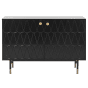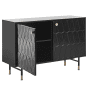 This functional sideboard will perfectly furnish your living room, bedroom or hallway, adding an extra place for storage. The cabinet is made of high-quality MDF and supported by metal legs with gold accent. A minimalist shape in black, combined with a unique pattern on the doors and matching elements, brings elegance into any interior. Details: Color: Black, Gold. Main material: MDF. Additional material: Metal, Particle Board. Weight: 43 Assembly: Full Assembly Required Legs Height: 21