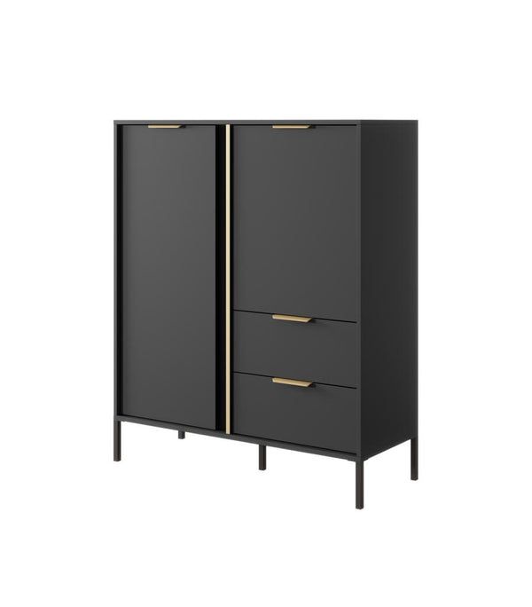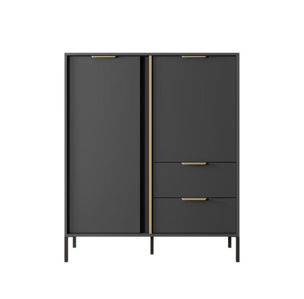 The Doran Highboard Cabinet is a stylish and functional addition to any modern living space. Measuring 103cm in width, this cabinet features a sleek anthracite finish complemented by elegant gold accents. It is designed with two hinged doors that open to reveal three spacious shelves, providing ample storage for your belongings. Additionally, the cabinet includes two drawers for added convenience, all enhanced by sophisticated gold handles. The sturdy black metal legs ensure stability while adding a contemporary touch. Crafted from high-quality 16mm laminated board with durable ABS edging, this cabinet is built to last. Assembly is required, and matching furniture pieces are available to create a cohesive look in your home.
