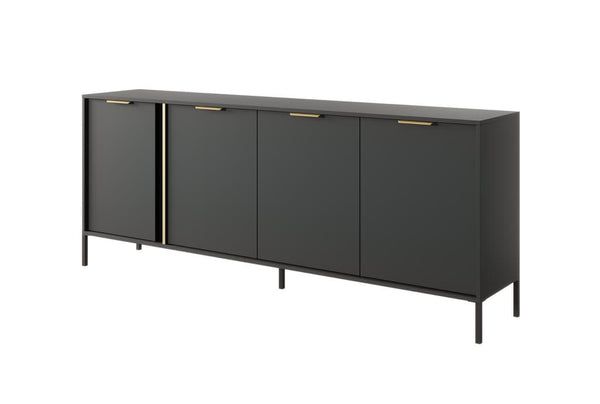The Doran Sideboard Cabinet is a sophisticated addition to any modern living space, measuring 203cm in width and finished in a striking anthracite color. This elegant cabinet features four hinged doors that open to reveal ample storage space with four sturdy shelves, perfect for organizing your belongings. The gold handles add a touch of luxury, while the black metal legs provide a contemporary contrast. Crafted from high-quality 16mm laminated board with durable ABS edging, this sideboard is designed for longevity and style. Assembly is required, and matching furniture pieces are available to create a cohesive look in your home.