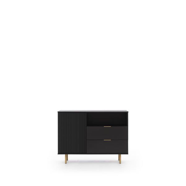 The Voka Sideboard Cabinet is a stylish and functional addition to any modern living space, measuring 107cm in width. Available in a sophisticated cashmere and black color scheme, this cabinet features one hinged door, one shelf, two drawers, and one open compartment, providing ample storage options. Its elegant gold metal legs add a touch of luxury, while the durable ABS edging ensures longevity. Crafted from high-quality 16mm laminated board with a milled MDF front, this sideboard combines aesthetics with practicality. Assembly is required, and matching furniture pieces are available to create a cohesive look in your home.