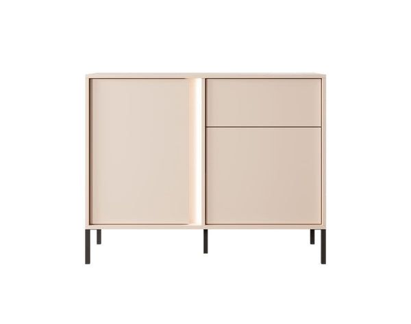 The Walton Sideboard Cabinet is a stylish and functional addition to any living space, measuring 104cm in width and finished in a sophisticated beige color. This cabinet features two hinged doors and a convenient push-to-open drawer, providing ample storage options. Inside, it includes two shelves for organized display or storage. The cabinet is supported by sleek black metal legs, enhancing its modern aesthetic. For those seeking to elevate their decor, optional LED lighting can be purchased separately. Constructed from high-quality 16mm laminated board with durable ABS edging, this sideboard is designed for longevity. Assembly is required, and matching furniture pieces are available to create a cohesive look in your home.