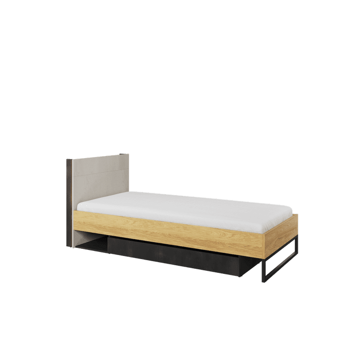 The Barcena Single Bed is a stylish and functional addition to any bedroom, designed specifically for the modern teen. With a width of 96cm, this EU single bed is crafted from high-quality 16mm laminated board, ensuring durability and longevity. Available in two elegant colors—Oak Hickory and Silk Flou with Raw Steel accents—this bed seamlessly blends with various decor styles. It features convenient storage options and is supported by sturdy metal legs, providing both stability and a contemporary look. The integrated LED lighting adds a unique touch, enhancing the overall ambiance of the room. Please note that the mattress is sold separately, and assembly is required. Additionally, matching furniture pieces are available to create a cohesive bedroom design.