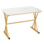 Our sintered stone dining table measures 110 x 70 x 75 cm (L x W x H), which is the perfect centerpiece for gatherings, whether in a cozy kitchen or a stylish dining area. The top-quality sintered stone tabletop, with a remarkable melting point of 1300 C, not only delivers outstanding heat resistance but also ensures unparalleled durability. Moreover, the tabletop surface is smooth and scratch-resistant, making it easy to clean stains with a damp cloth. The robust metal frame, complete with stable X-shaped supporting bars, provides a reliable and safe structure, built to last. Adorned with a luxurious gold frame and a faux marble top, this table not only adds a touch of sophistication to your space but also elevates the aesthetic appeal of any room.