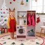 This all-in-one double-sided play kitchen combines cute design with practical features like a water dispenser, clothes hanger and blackboard menu. Plus, this pretend kitchen toy boasts ample storage, including racks, hooks and shelves to keep everything organized. The realistic elements, including a sink, microwave, oven, washing machine, interactive stove with rotatable knobs and rang hood with real lights and sounds, engage children in sensory-rich role-playing that fosters creativity and developmental skills. Moreover, designed with safety in mind, with rounded corners and splinter-free surfaces, this wooden kitchen set is the perfect gift for little chefs aged 3 and up, blending fun, education and imagination seamlessly.