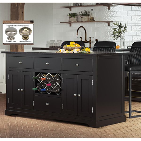 Additionally, two sturdy painted metal wine racks hold up to 16 bottles, ensuring your favorite beverages are always at hand. Supplied with 2 sets of knobs for customization and featuring exceptional build quality, this island is designed to last a lifetime. Complete with heavy-duty packaging, it's available in a choice of four base colors and three granite tops. Experience the ultimate in kitchen versatility with our stylish and multifunctional kitchen island.
