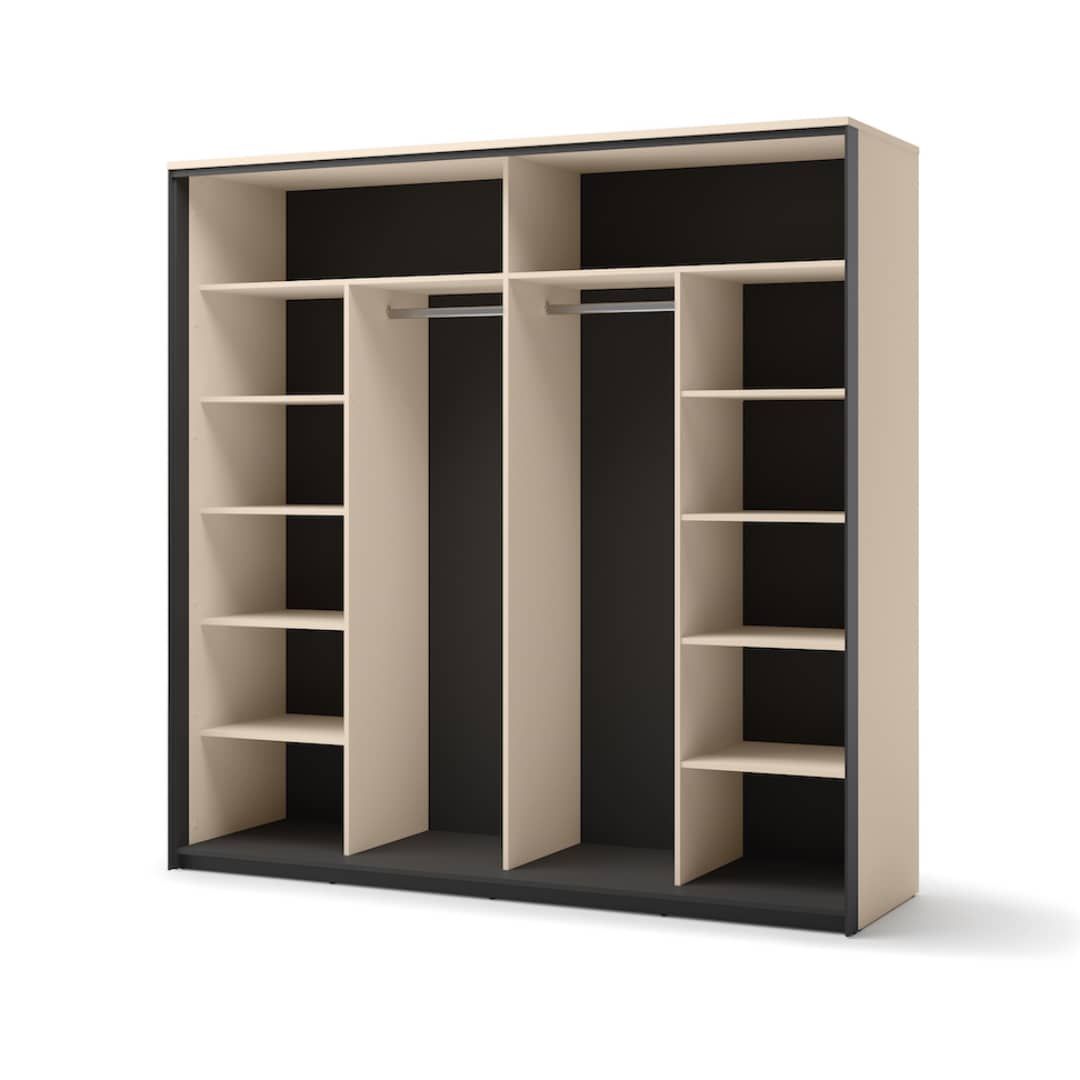 Bring sleek storage and contemporary style to your bedroom with this spacious wardrobe. Featuring a modern beige and black finish, it includes two sliding doors, one with a full-length mirror for added functionality. Inside, you’ll find eight roomy shelves and two sturdy hanging rails to help organise clothes, accessories, and more. Built-in LED lighting offers a soft glow, making it easier to find your belongings. Crafted from durable 16mm high-quality laminated board, this wardrobe is built to last while being easy to maintain. Part of a matching furniture range for a coordinated bedroom look. Assembly is required.