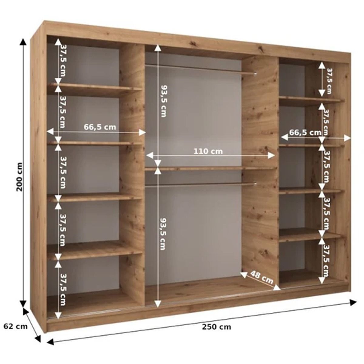 The TIVERTON Sliding Door Wardrobe offers a stylish and functional storage solution for any bedroom. With a generous width of 250cm, this wardrobe features three sliding doors that provide easy access to its spacious interior. Crafted from high-quality 16mm laminated board, it is available in multiple finishes, including White, Black, Oak Artisan, and Oak Sonoma, allowing for seamless integration into various decor styles. Inside, the wardrobe boasts eight shelves and two hanging rails, providing ample space for clothing and accessories. Optional drawers can be purchased separately for additional organization. The wardrobe is designed with silver plastic handles and PVC-finished edges, ensuring durability and a modern aesthetic. Assembly is required, making it a practical choice for those seeking both elegance and utility in their storage solutions.