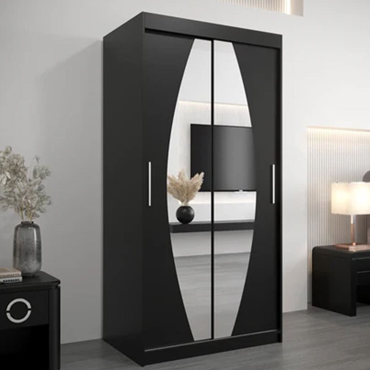 Sliding Wardrobe - WRIGHT 2 Door Mirrored Wardrobe Black 100cm
