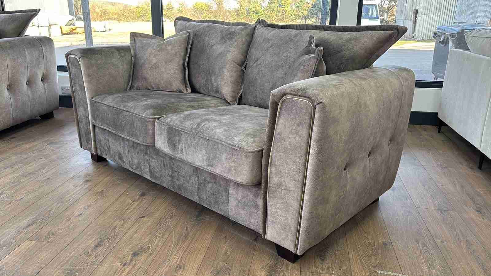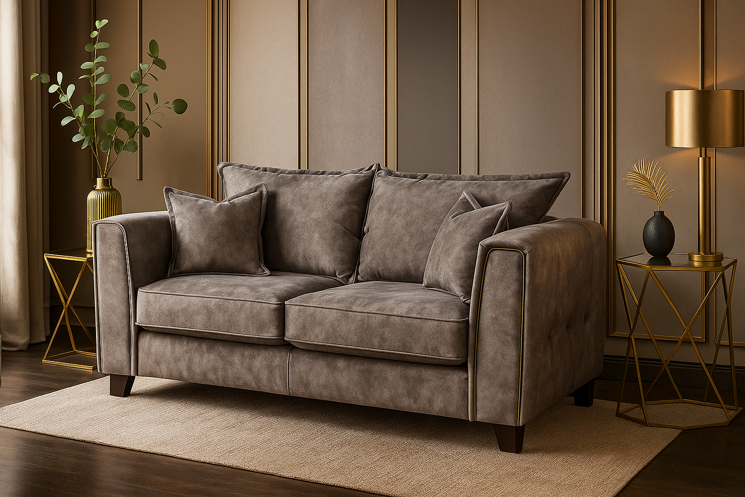 Solarae Sofa Brown 3 Seater blends luxury with quilted sides and high back cushions. Metal arm trim and wooden feet add flair. Also available in Grey, Black, Large Corner, 3+2 Set, 2 Seater, Armchair. Its spacious design offers cozy seating, while the Brown fabric adds warmth. Perfect for lounges or family rooms, this sofa combines durability with a stunning aesthetic for lasting comfort.