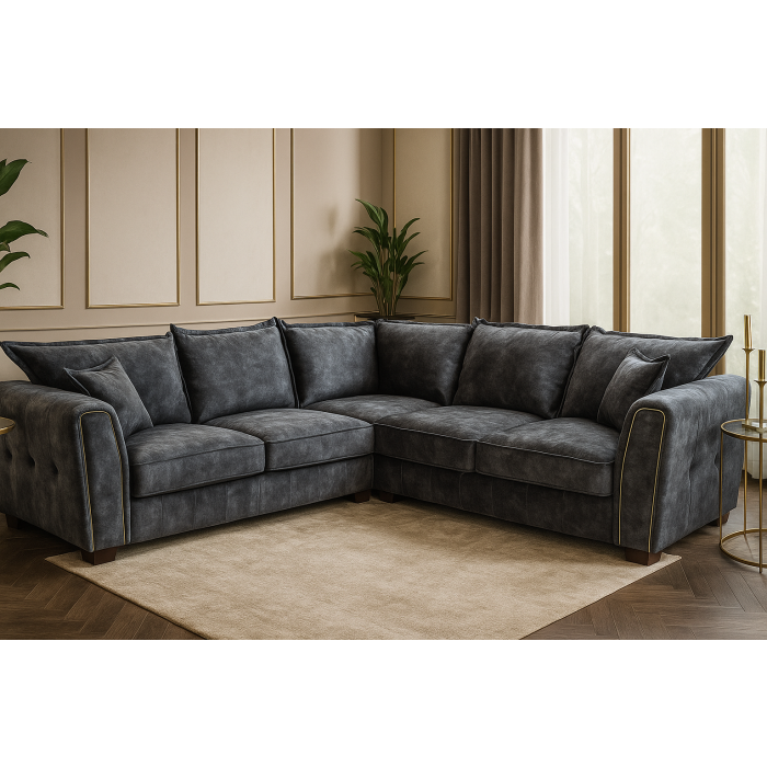 Solarae Sofa Black Large Corner blends bold style with quilted sides and high back cushions. Metal arm trim and wooden feet add flair. Also available in Brown, Grey, 3+2 Set, 3 Seater, 2 Seater, Armchair. Its plush cushioning ensures comfort, while the L-shape suits modern lounges. The Black faux leather adds sleek elegance, perfect for stylish family rooms or gatherings, combining durability with stunning design.