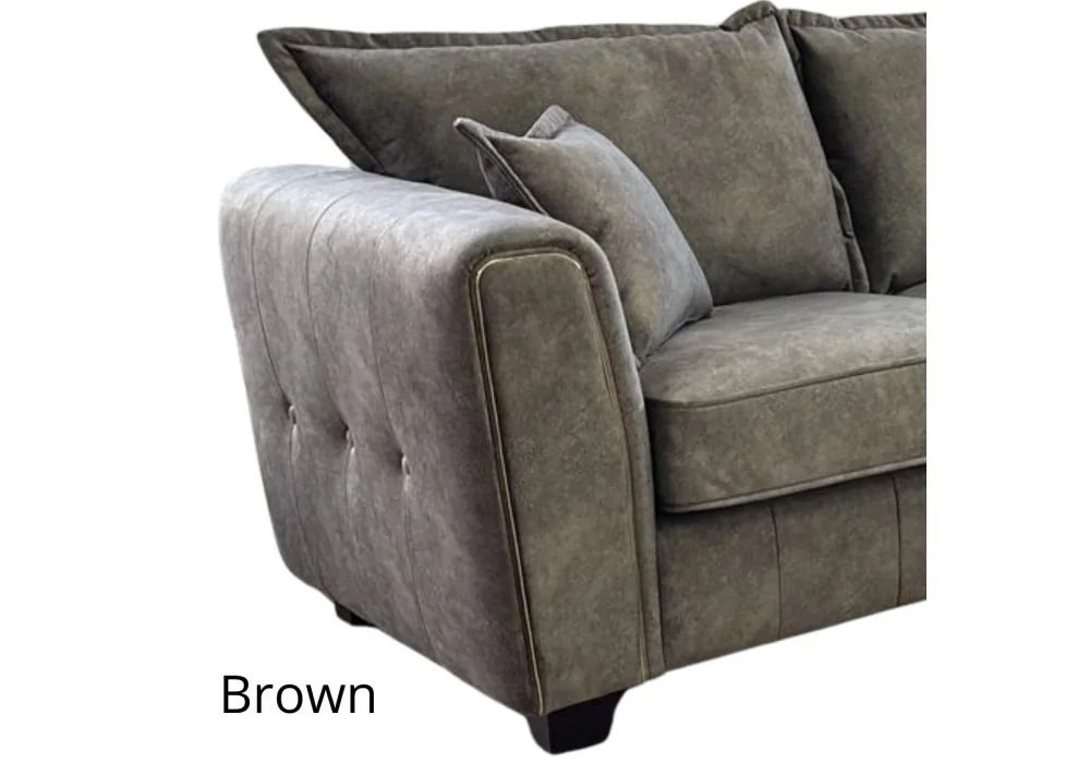 Solarae Sofa Brown Large Corner offers luxury with quilted sides and high back cushions. Metal arm trim and wooden feet enhance style. Also available in Grey, Black, 3+2 Set, 3 Seater, 2 Seater, Armchair. Its plush cushioning ensures comfort, while the spacious L-shape fits modern lounges. The Brown fabric adds warmth, ideal for cozy family rooms or elegant gatherings, blending durability with stunning design.