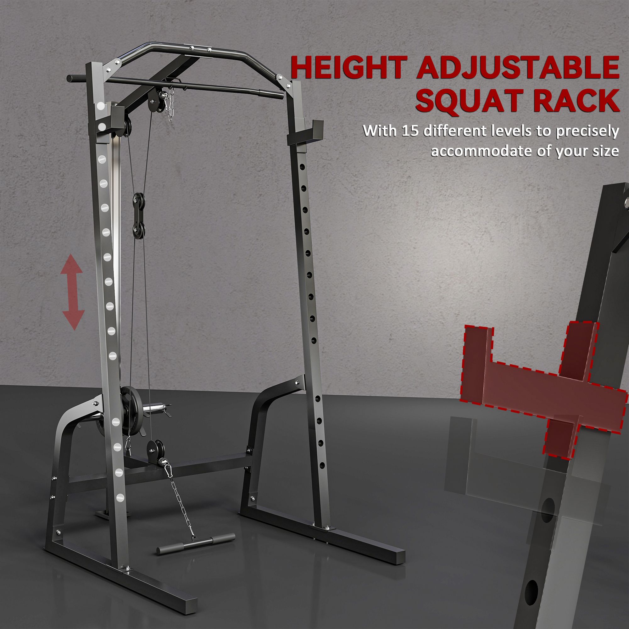 Home weight cage: sculpt muscles like a pro at home. This home gym power cage enables you to work your arms, legs, shoulders, back and chest using a pull-up stand, push-up stand, barbell rack, lat pull-down bar, low row bar and pulley system. Adjustable resistance: set fitness goals with an easy squat rack with lat pull down. Work your way up to 25 kg per arm or 50 kg total weight. Our squat rack can work with 2. 5 cm or 5 cm opening weight plates. Height adjustable squat cage: our power cage fine tailors to the user, allowing better form for safety and results. Adjust the height of the barbell rack between 15 settings and users of all shapes and sizes are accommodated. Walk-in & add-on: this is the machine that can help you do it all with compound exercises for a full-body shred. Introduce equipment like a weight bench to our cable cage and you can open an