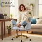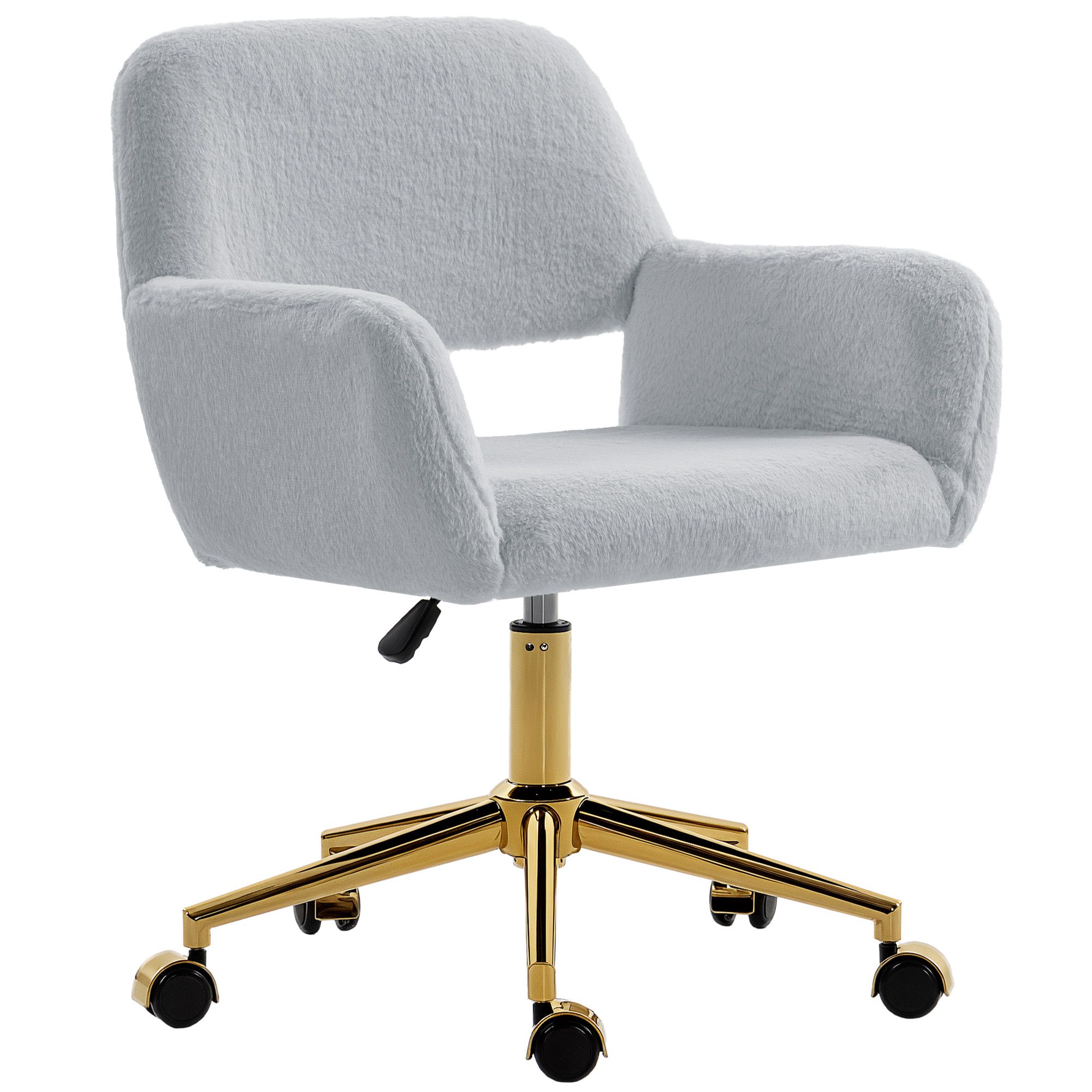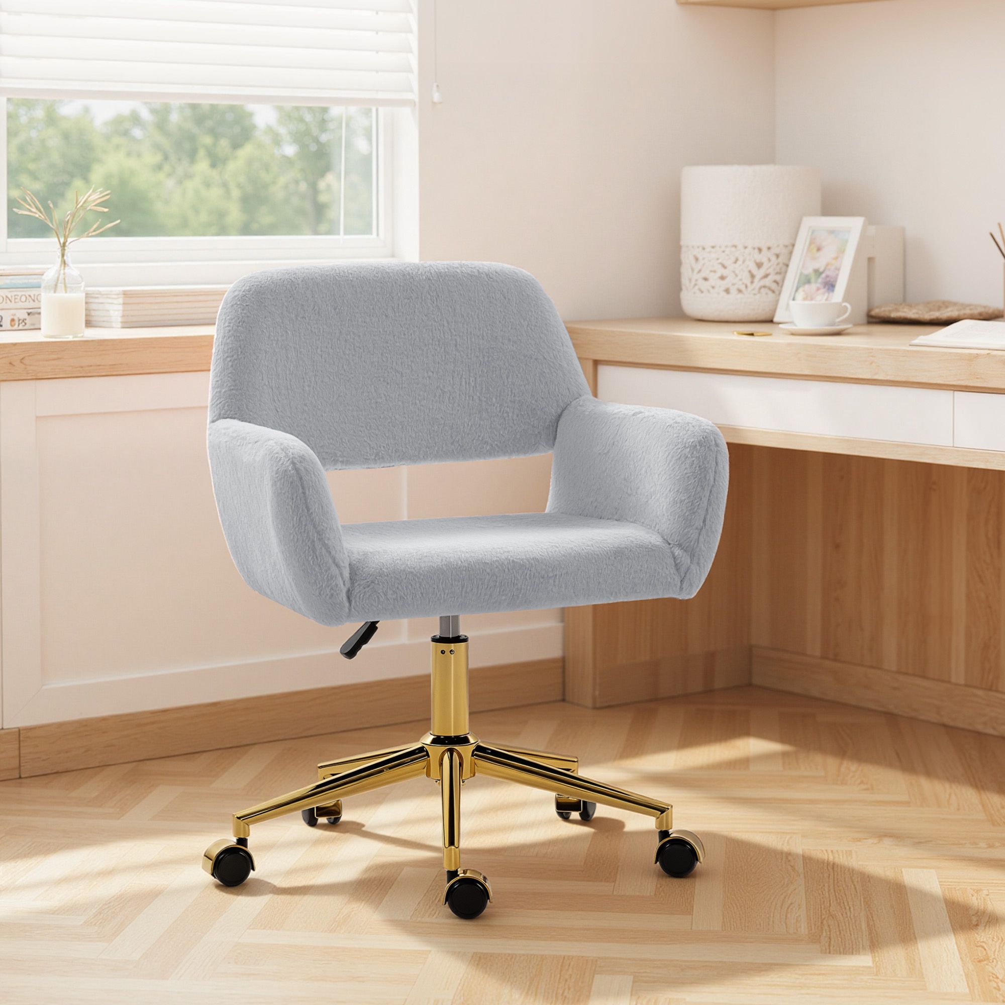 High-density foam filling, with faux fur upholstery: sit and work comfortably in this office chair - love using it all day long. Faux fur brings a soft and cosy finish - looks and feels lush. 45-55 cm seat height, 360° swivel: adjust and set to the position you want - easy to make this desk chair level with your desk. 360° seat movement works freely with your body movement. Steel base: an electroplated steel base and multilayer board bring extra stability and long-lasting performance to your swivel chair. It supports up to 120 kg for dependable daily use. Five wheels: pu wheels allow you to glide this vanity chair effortlessly across most floors—whether you're seated or moving it out of the way. Dimensions: 78-88 H x 60 W x 57 D cm, weight capacity 120 kg. Assembly required. Made from fire-retardant materials