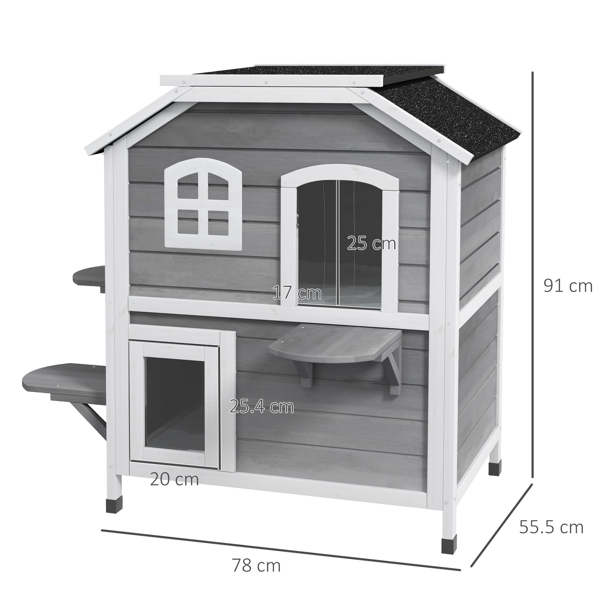 - Dimensions: 78L x 55.5W x 91H cm. Bottom house: 72L x 48W x 31H cm. Top house: 72L x 48W x 43H cm. Top door: 17L x 25H cm. Escape door: 20L x 25.4H cm. Side door: 17L x 22H cm. Jump platform: 25L x 20W cm. Off the ground height: 8 cm