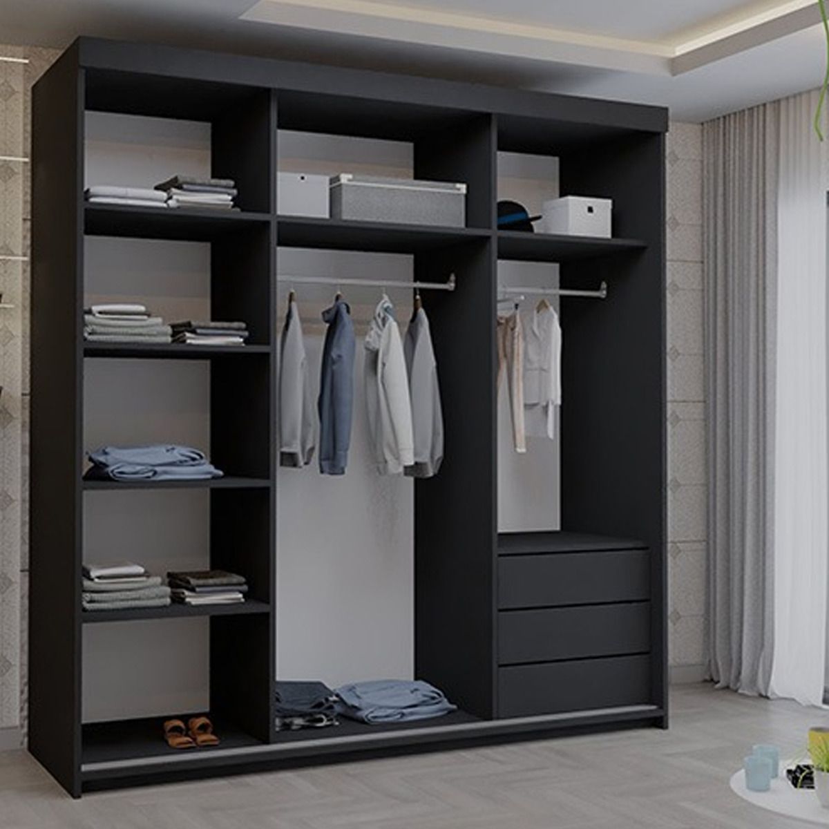 The SOLVIA Black 203cm Sliding Wardrobe combines striking aesthetics with extensive storage. Its mirrored sliding doors enhance room openness while offering quick and easy access. Inside, you’ll find 2 hanging rails, 5 shelves and 3 drawers—ideal for storing a large variety of clothing and accessories. With its bold look and practical construction, this wardrobe suits modern, luxurious bedroom interiors.