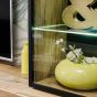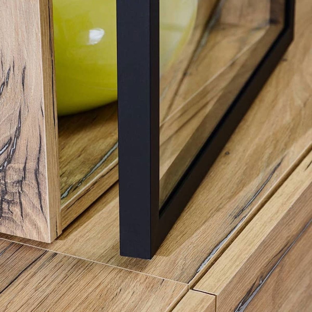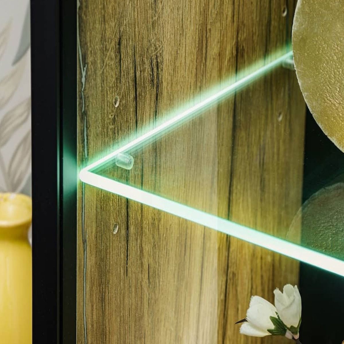 Elevate your entertainment experience with the Sorenzo Haven TV Entertainment Unit in Oak Flagstaff—a perfect blend of functionality and style. This unit boasts one partially-glazed hinged door, four shelves (including two glass shelves), and four closed compartments for organized storage. Enjoy a customizable ambiance with the included powered LED lighting system. Crafted from premium laminated board in timeless Oak Flagstaff, this unit stands out with its quality craftsmanship and modern design, featuring sleek black metal legs.