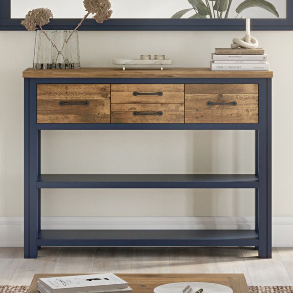 The hand-sprayed painted sections and clear lacquer-treated natural areas showcase the timber's beauty. This high-end console table, with three drawers and two fixed shelves, offers both functionality and elegance. this collection requires no assembly, promising enduring style for a lifetime.