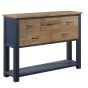The hand-sprayed painted sections and clear lacquer-treated natural areas showcase the timber's beauty. This high-end console table, with three drawers and two fixed shelves, offers both functionality and elegance. this collection requires no assembly, promising enduring style for a lifetime.