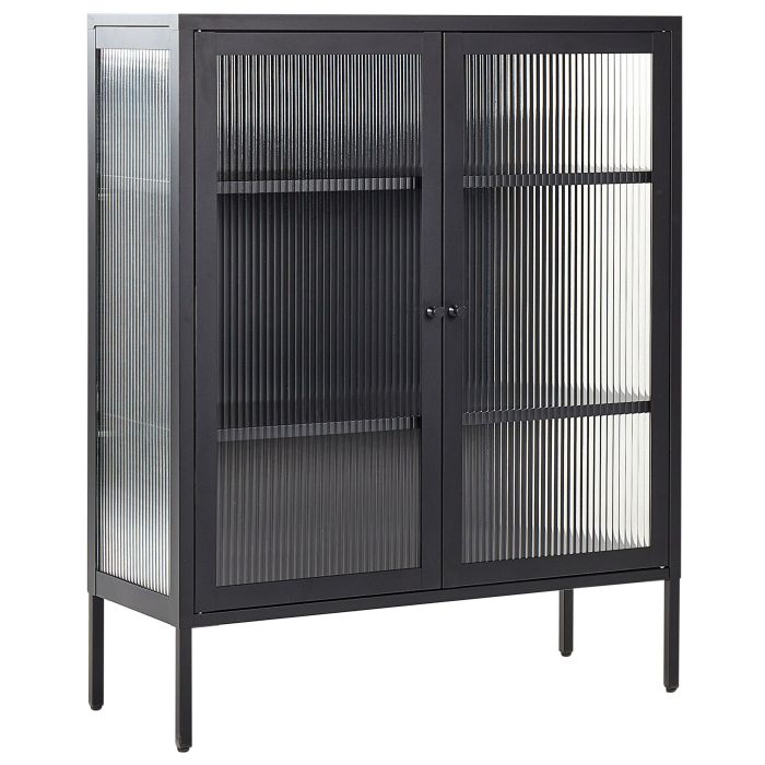 Complete your interior with a decorative sideboard that will spruce up the look of the whole design. In this two-door cabinet, you can display all your favourite vases, dishes or books that will create a special effect thanks to the fluted glass placed in the front and sides. The piece is made from steel, which guarantees stability as well as durability, and the matt finish in black adds a glamorous touch. Details: Color: Black. Main material: Steel. Additional material: Glass. Weight: 30 Assembly: Full Assembly Required Legs Height: 18