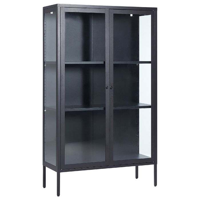 Complete the interior of your living room or dining room with a classic glass highboard that will allow you to display your favourite items, decorations or accessories in a way that will attract the attention of your guests. The glass front and sides combined with the steel construction create a timeless, elegant design, ideal for classic interiors. In addition, the leg caps will protect your floor from scratches. Details: Color: Black. Main material: Steel. Additional material: Glass. Weight: 38 Assembly: Full Assembly Required Legs Height: 18