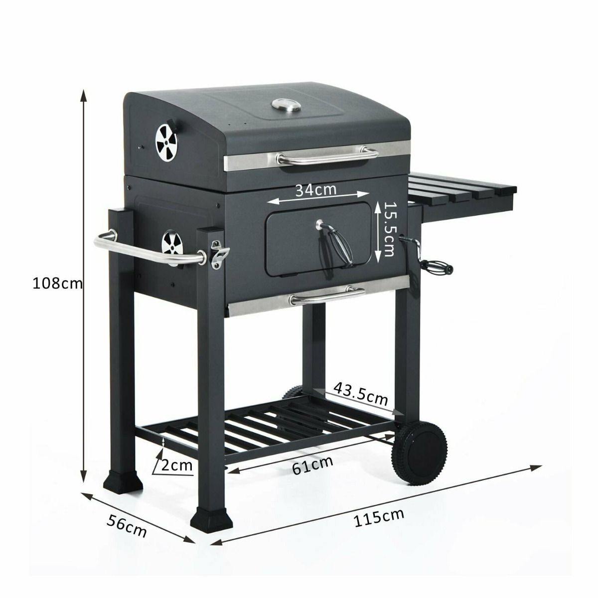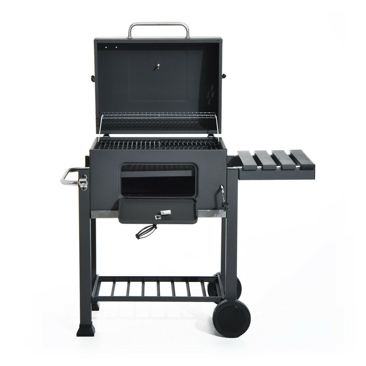 - Middle compartment for holding charcoal, with a secure door and stainless steel handle