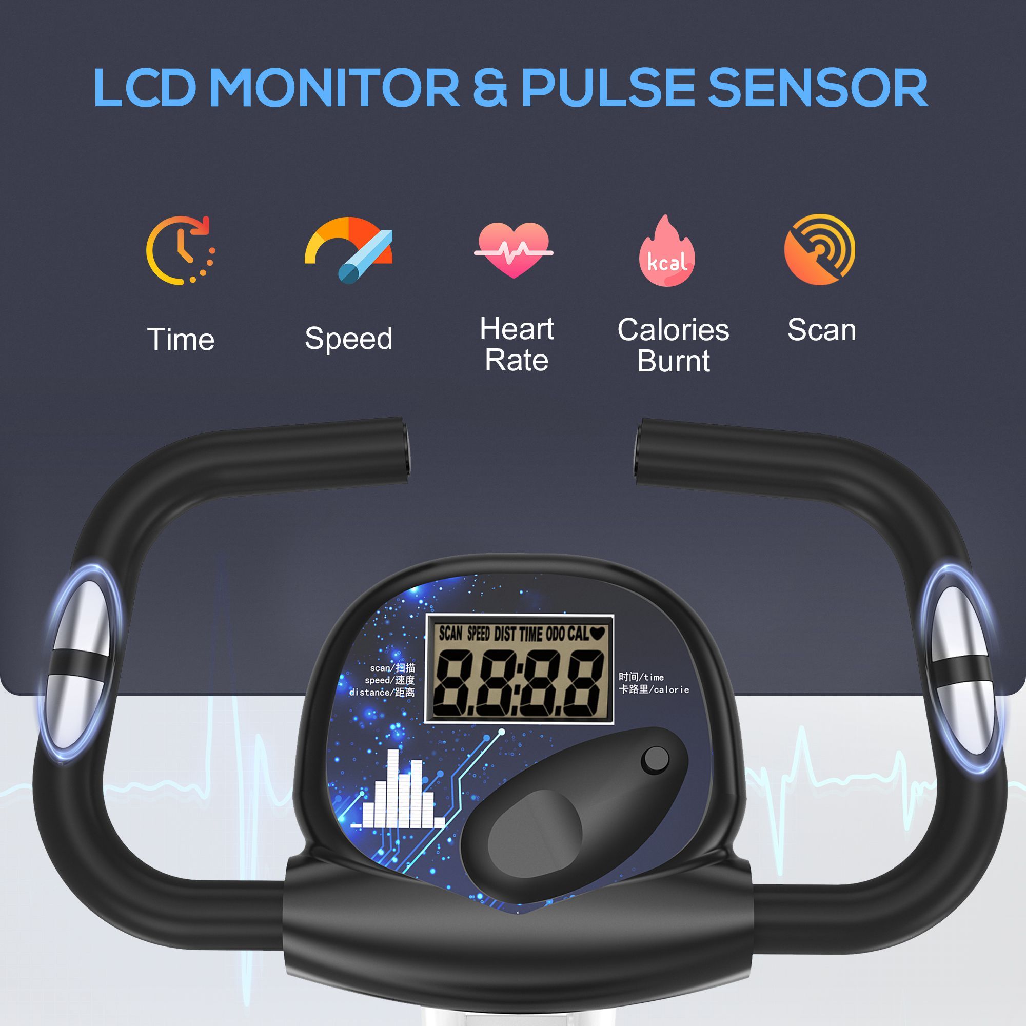 - LCD MONITOR: The indoor cycling bike is equipped with LCD display which keeps track of your heart rate (via metal detecting panels on handlebar), speed, distance, time elapsed and calories burnt to record progress.